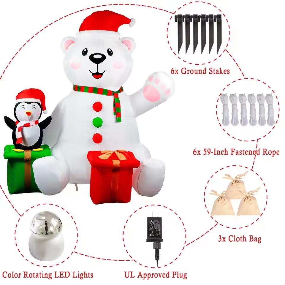 Package IncludedYou will get Christmas inflatables outdoor decorations which have a 6FT tall polar bear with a Christmas hat, a cute penguin with a Christmas hat and 2 gifts wrapped box inflatables, and color rotating LED light, 5pcs ground stakes, 3 cloth bags, 2pcs 59 inches fastened ropes, a UL approved plug and a gift box. Place this Christmas inflatable in your yard can bring a happy atmosphere to your neighbors, friends, and family for holiday cheer and welcomes them with warm wishes.