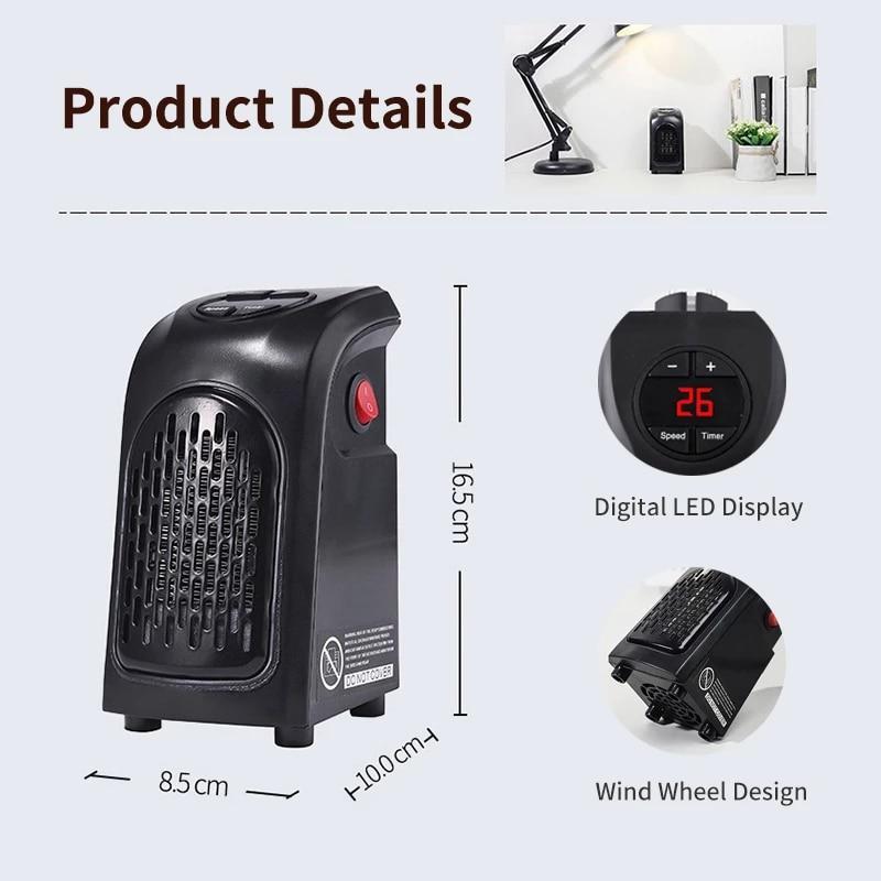 Product Weight: 500g Product Specifications: 16.5 x 14.5 x 8.5cm Power supply AC220-240V, 50Hz/60HZ 1.Product Overview: There are temperature display and time device, which can be timed and the time is 1-12 hours. There are four buttons. Press "+", "-" to adjust the temperature; Speed cut can adjust the speed, Timer can be timed. There are red switches on the sides of the product. 2. Convenient and portable: plug directly into the wall or have a socket. Save space and be easy to carry. 3. Suitable for: indoor heating, personal small space, dormitory, office, camping (as long as there is a socket), basement, garage, etc. 4. Different situations: This product has different plugs and is suitable for people from different regions.Will send the specifications for your region 5. Quality service: If you have any questions, please feel free to contact us, we will reply to you as soon as possible within 48 hours.