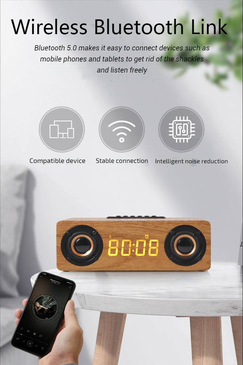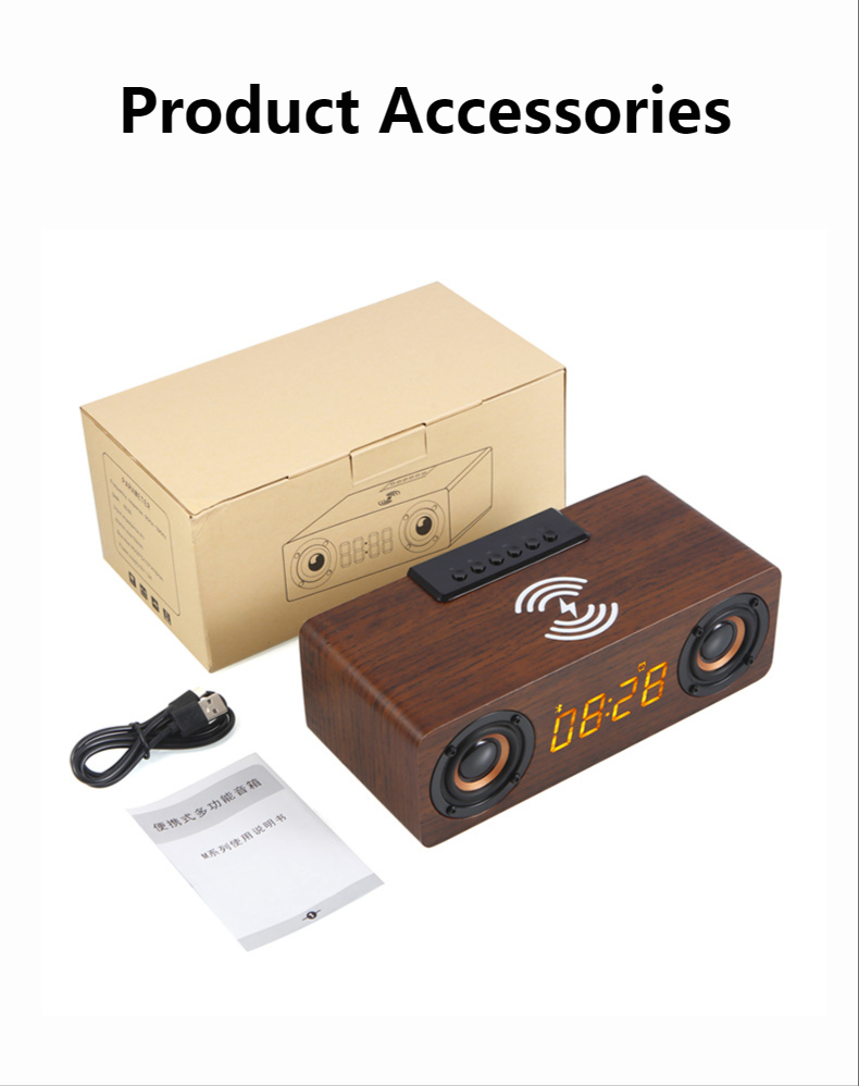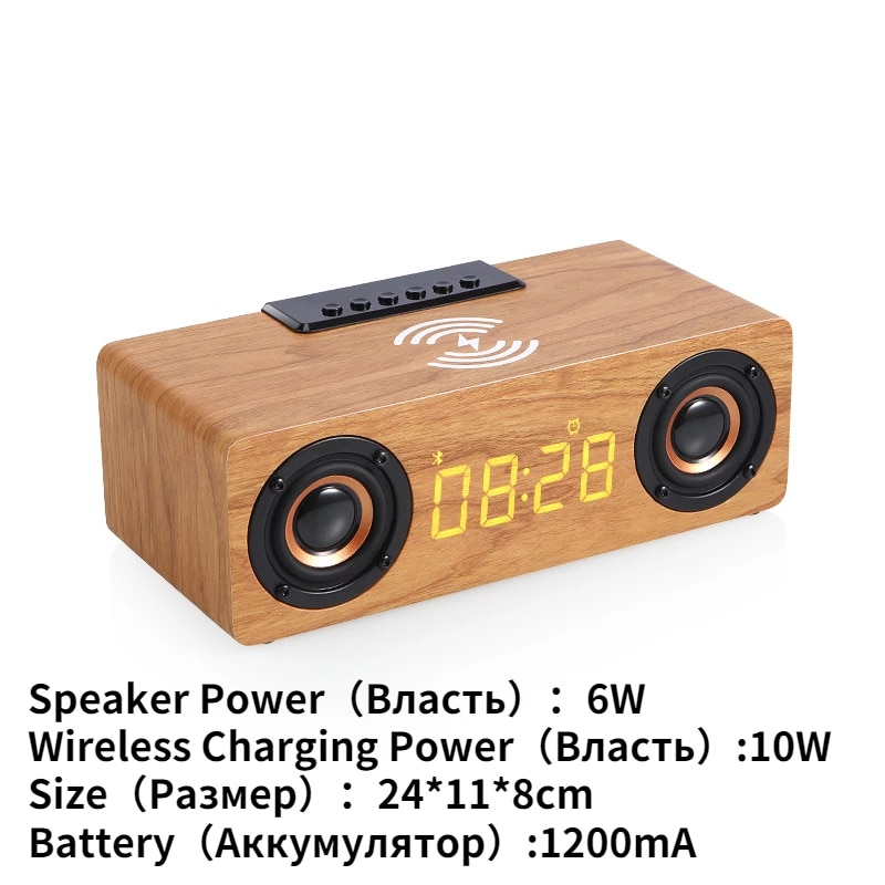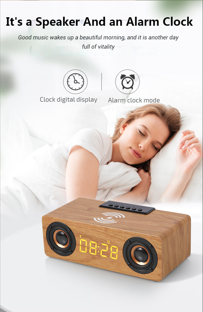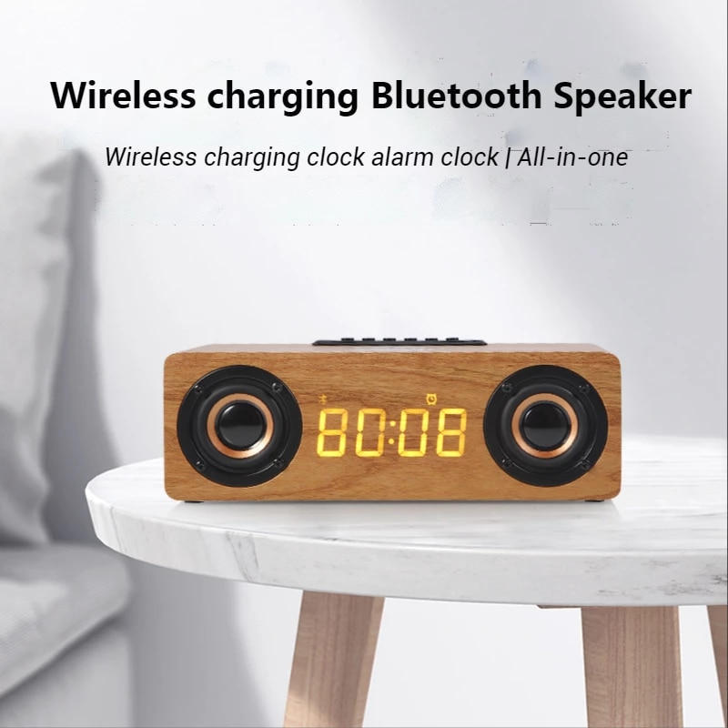 Fast Wireless Charger Wooden Wireless Bluetooth Speaker Alarm Clock with Subwoofer 3D Stereo boombox Sound bar for Computer TV