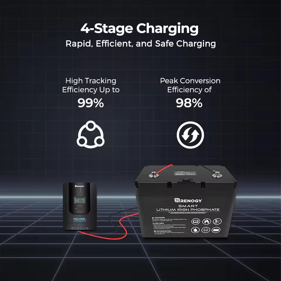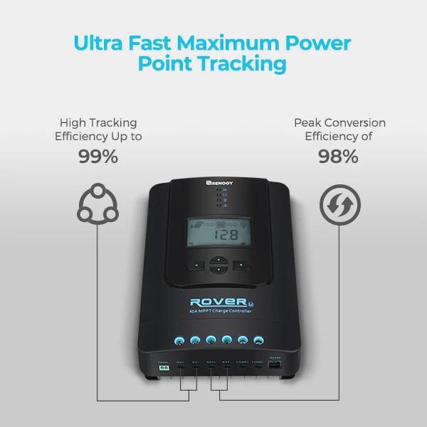 Innovative MPPT DesignDie-cast aluminium design ensuring excellent heat dissipation and Renogy Maximum Power Point Tracking technology with a high tracking efficiency of up to 99% and peak conversion efficiency of 98% It is the best charging solution even in cloudy environments where the max power point of the solar panels will fluctuate all day