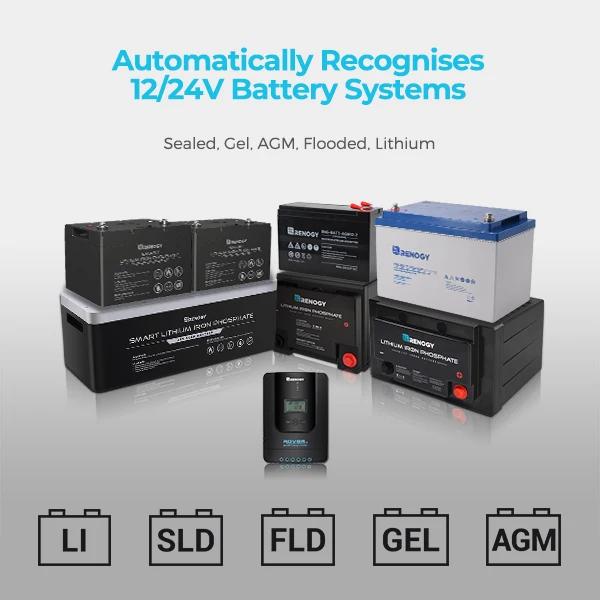 12V/24V Automatically Detect Automatically detects 12V or 24V DC system voltages (for Non-Lithium battery types), and the LCD screen and multiple LED indicators display the solar charging and battery operation information, customizable parameters, and error codes